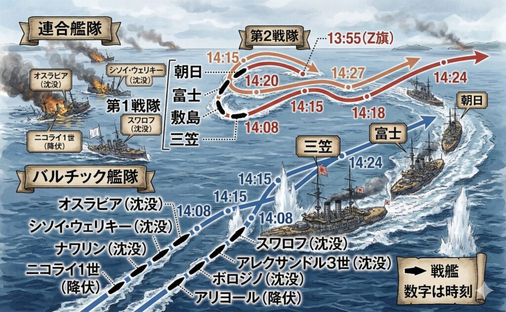 1905年5月27日、日本艦隊はロシア艦隊の進路を見極め、大きく進路を変更します。